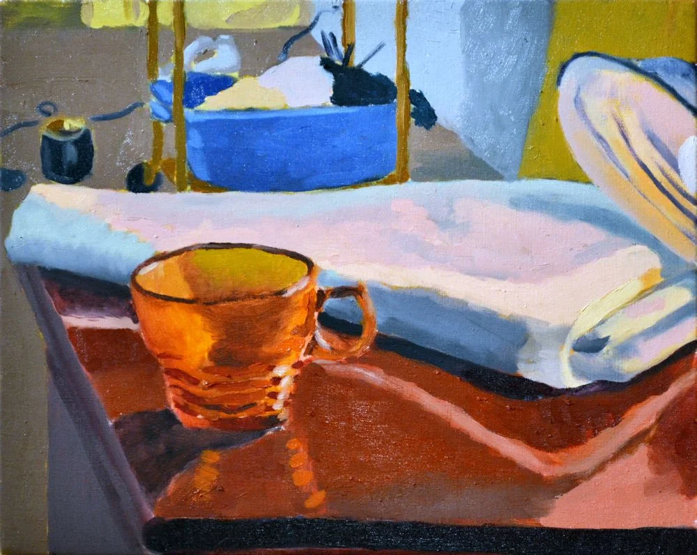 Ragan: Yes. A lot of them are stuff from memories. It is more engaging and interesting painting something that you have a history with. It is fun painting someone you know and have a relationship with rather than a stranger. I like to pick objects that I have seen for a long time in my life. For some reason, I feel so much better about it being materialized like a glass my mom has had. I like to paint handmade pottery. I like to go to potters and buy their handmade mugs and glasses. I find they are interesting shapes. When I was in school, I used IKEA mugs or whatever I had, but you just get bored of those mechanical shapes. I like things with more personality in them. Also, just things that I have grown up with like the orange glass in my still life. I remember we had a set of those glasses in the house. I always thought, these are cool glasses like the colour when the light shines through it. They are cool glasses. That is the last one because they all broke. I think the last one is broken now. One still life has a Mexican glass. My mom’s friend bought them from Mexico. They were such cool shapes. They are hand blown. They look so crazy with the drapery. If you are not interested in painting it, if it is a super boring object, it is just not going to turn into an interesting painting.